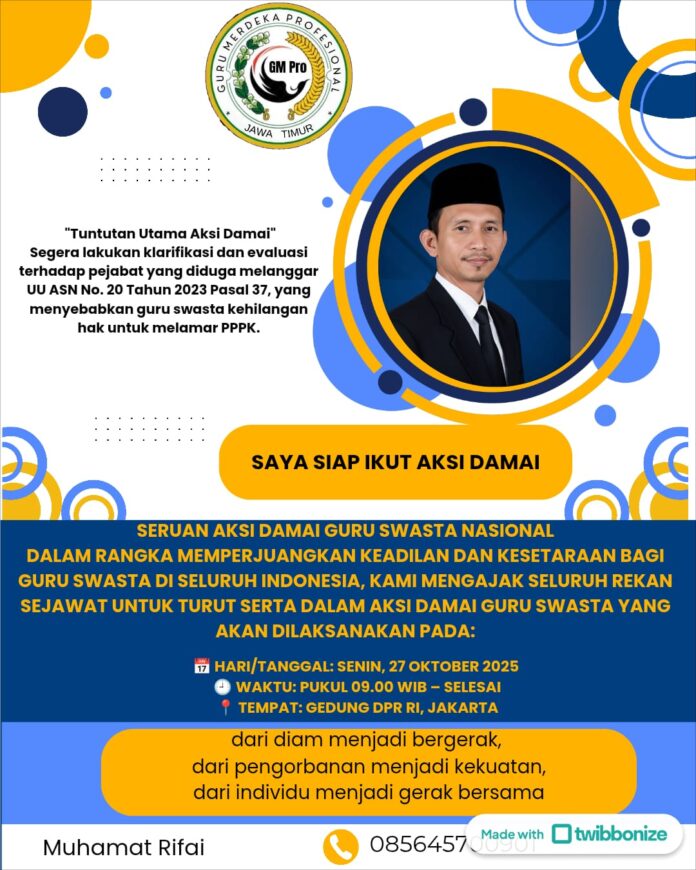 Aksi damai dijadwalkan berlangsung pada Senin, 27 Oktober 2025, pukul 09.00 WIB. Para guru swasta menuntut pemerintah untuk segera mengevaluasi dan mengklarifikasi pejabat yang diduga melanggar UU ASN Nomor 20 Tahun 2023 Pasal 37, yang dianggap telah menghilangkan hak guru swasta untuk mengikuti seleksi PPPK.