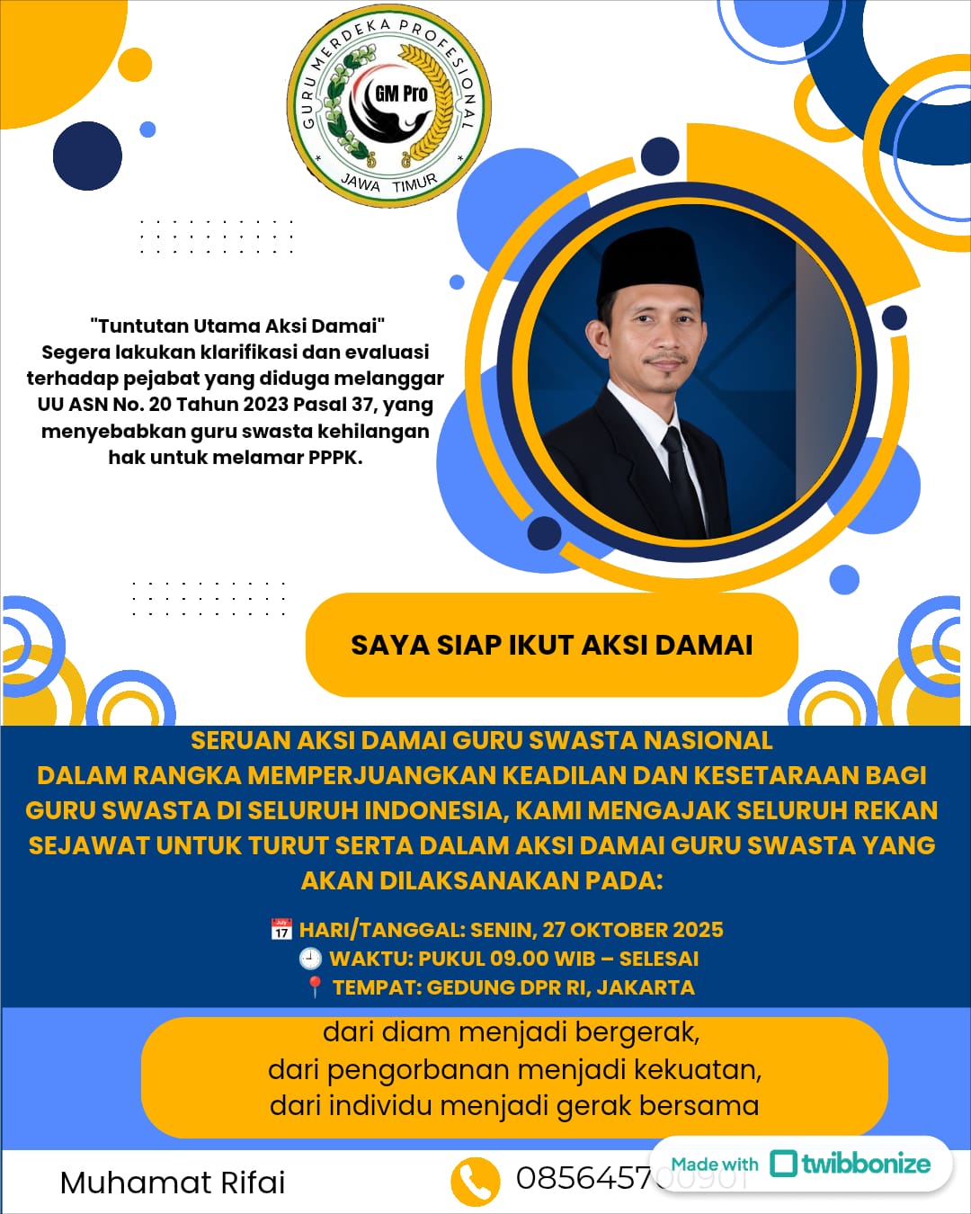GM Pro juga mengajak seluruh guru dan masyarakat luas untuk mendukung perjuangan ini, baik dengan hadir langsung dalam aksi damai maupun melalui kampanye digital. Dukungan dapat diberikan dengan memasang Twibbon resmi Aksi Damai Guru Swasta di tautan: