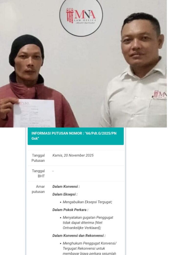— Pengadilan Negeri Gresik menjatuhkan putusan tegas dalam perkara perdata Nomor 66/Pdt.G/2025/PN.Gsk. Dalam putusan yang dibacakan majelis hakim, eksepsi Tergugat—ayah kandung anak korban kekerasan seksual—dikabulkan seluruhnya, dan gugatan Penggugat dinyatakan tidak dapat diterima (Niet Ontvankelijke Verklaard/NO).